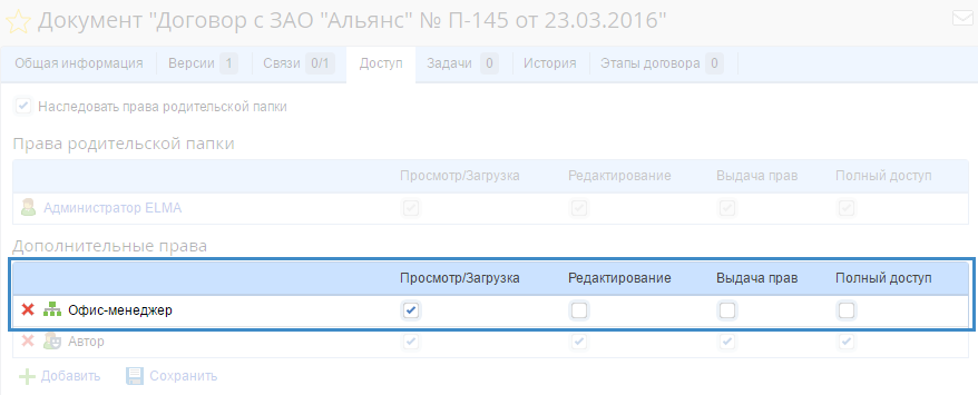 Кнопка Автор позволяет добавить/удалить из прав доступа автора документа.