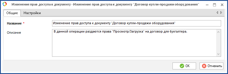 Рис. 2. Настройки операции "Изменение прав доступа к документу". Вкладка "Настройки"