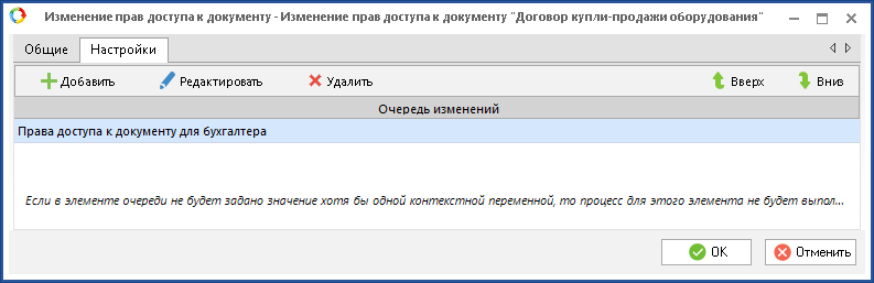 На данной вкладке (рис.2) необходимо добавить один или несколько элементов очереди изменений прав доступа к документу. При достижении экземпляром процесса данной операции, в системе ELMA будут добавлены и/или удалены права доступа, указанные в элементах очереди.