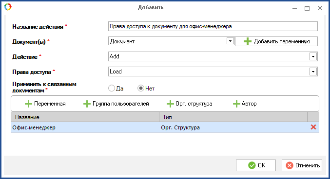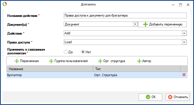Кнопка Переменная позволяет выбрать или добавить контекстную переменную типа «Пользователь», чтобы задать пользователя, для которого будут выданы/удалены права к документу. В данной переменной может быть выбран любой тип связи, т.е. переменная может содержать как пользователя, так и список пользователей.