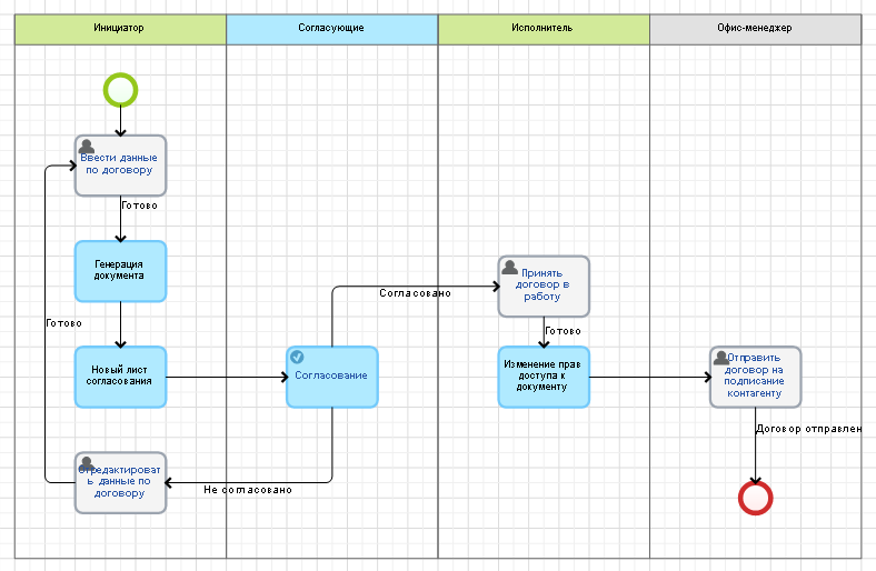 В качестве примера рассмотрим процесс согласования договора. Инициатор вводит необходимые данные для формирования договора, далее договор отправляется на согласование и принимается в работу Исполнителем. По окончании процесса согласования договора для Офис-менеджера раздаются права на Просмотр/Загрузку, после чего он отправляет оригинал документа контрагенту.