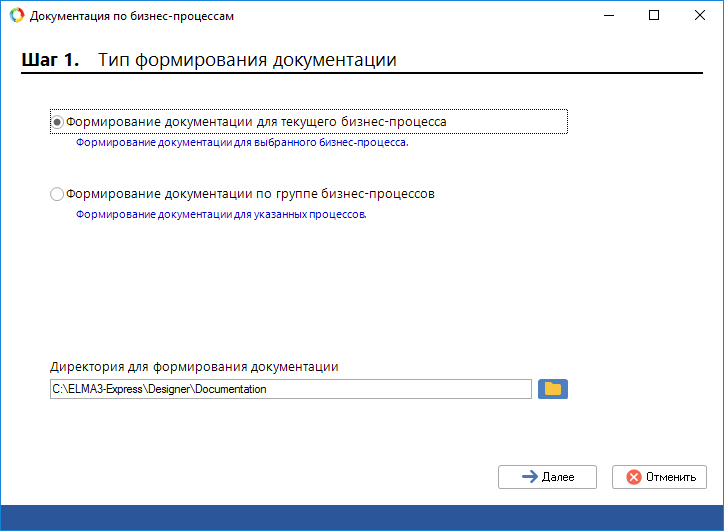 На первом шаге задается тип операции формирования документации: для текущего процесса или группы процессов. Если не выбран ни один процесс, тип "Формирование документации для текущего процесса" недоступен. От типа формирования зависит набор настроек, доступных на втором шаге мастера.