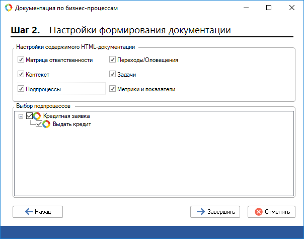 В области Выбор подпроцессов можно выбрать внутренние подпроцессы текущего процесса, по которым необходимо получить документацию (рис. 2). При этом на документацию по внутренним подпроцессам распространяются настройки содержимого, заданные для родительского процесса.