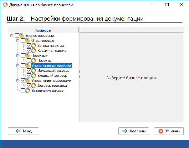 Если выбран тип "Формирование документации по группе бизнес-процессов", на втором шаге предлагается выбрать процессы, по которым необходимо сформировать документацию (рис. 4). При этом нельзя отдельно выбрать внутренние подпроцессы. Они включаются в документацию соответствующих родительских процессов по умолчанию.