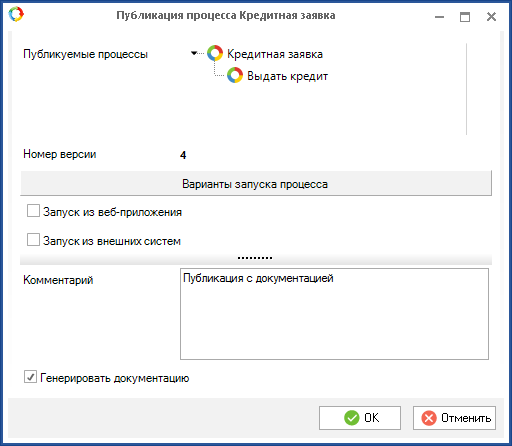 Для публикации документации по процессу в веб-приложении, необходимо при публикации процесса активировать настройку Генерировать документацию (рис. 6).