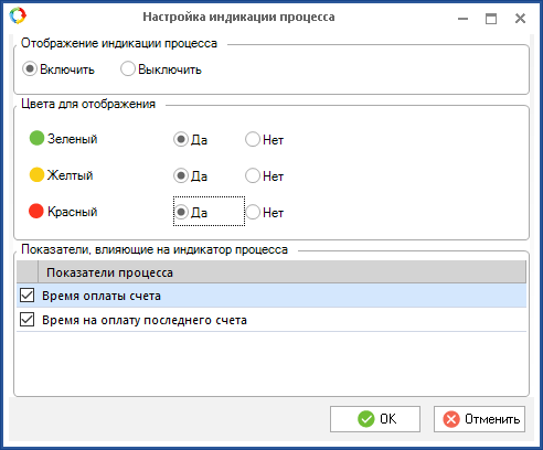 Индикатор состояния процесса будет желтым, если хотя бы один из показателей, от которых он зависит, находится в диапазоне допустимых значений, и нет показателей, находящихся в диапазоне недопустимых значений;