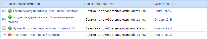 Индикатор отображается в веб-приложении около названия экземпляра процесса в виде зеленого, желтого или красного кружка. Индикатор отображается на портлетах "Мои процессы" и "Монитор процессов", в разделах Мои процессы и Монитор процессов. Ориентируясь на состояние индикатора пользователь может принимать оперативные решения по работе с соответствующим экземпляром процесса.
