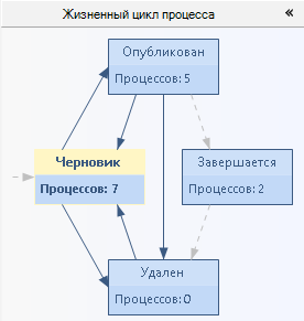 На диаграмме жизненного цикла показана схема переходов между статусами версий процесса, а также количество процессов, имеющих версию с соответствующим статусом. Если щелкнуть мышью по узлу схемы с наименованием статуса, под ней отобразится определение статуса, а справа отобразится содержимое соответствующей это статусу вкладки.