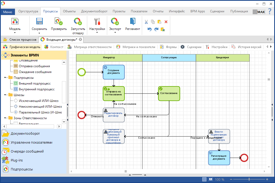 Рис. 1. Карточка процесса "Входящий договор", раздел "Графическая модель"