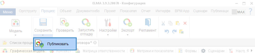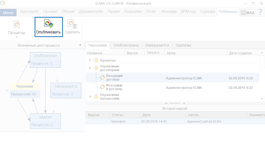 на вкладке Дизайнера ELMA Публикация в разделе Процессы выбрать процесс и нажать кнопку Опубликовать (рис. 3).