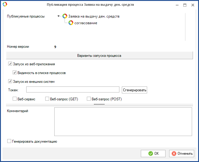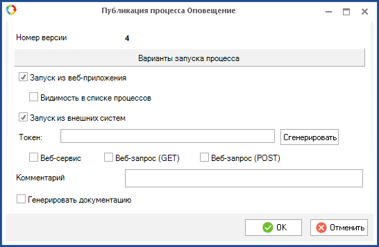 Нажатие кнопки Сгенерировать для уже сформированного токена приводит к его перезаписи новым значением. При этом старый токен более не может быть использован для работы с данным процессом.