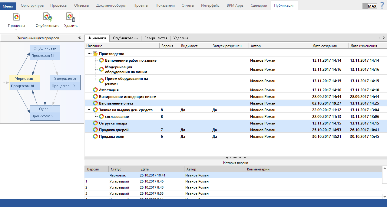 Публикация процесса - процедура создания или обновления модели процесса, используемой в веб-приложении для реализации работы по бизнес-процессу. В веб-приложении могут одновременно выполняться процессы, запущенные с использованием моделей процесса, опубликованных в различное время. Для обеспечения непрерывности работ по процессу и для предотвращения ошибок используются версии моделей бизнес-процессов.