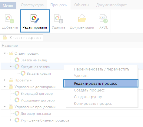 Открыть процесс для редактирования можно из списка процессов одним из трех способов (рис. 1):