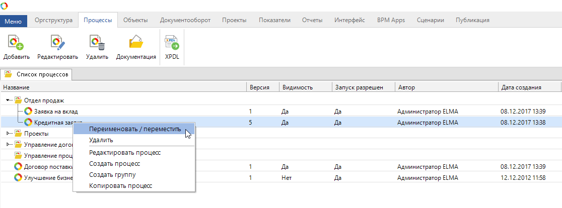 Для переименования процесса или перемещения его в группу процессов необходимо использовать пункт контекстного меню Переименовать/переместить (рис. 1).