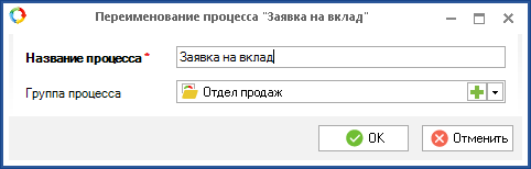 В появившемся окне (рис. 2) потребуется указать новое название процесса, при необходимости выбрать группу, в которой он в дальнейшем будет отображаться в списке процессов, и нажать кнопку ОК.