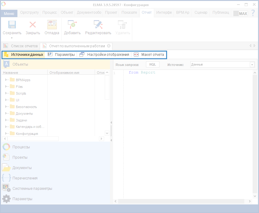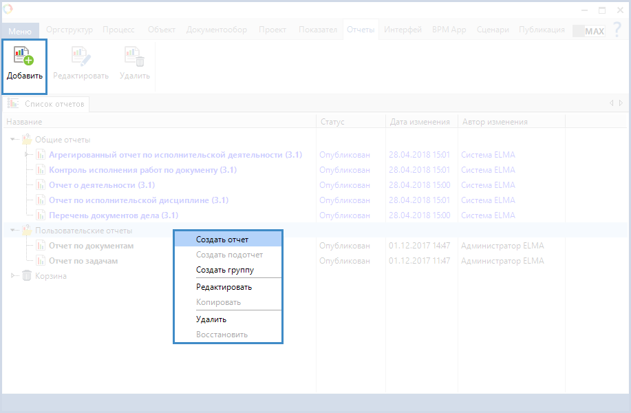 Отчет в системе ELMA может быть создан несколькими способами. Для этого необходимо в Дизайнере ELMA на вкладке Отчеты нажать на кнопку Добавить, расположенную в верхнем меню, или на кнопку Создать отчет, расположенную в контекстном меню (рис. 1).