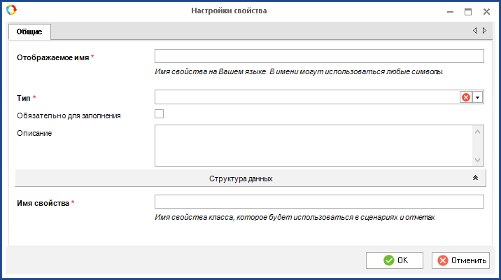 Имя свойства * – уникальное имя параметра латинскими символами. По умолчанию имя параметра автоматически задается на этапе создания параметра при заполнении поля Отображаемое имя * . При необходимости данное поле может быть заполнено вручную. Данное поле является обязательным для заполнения.