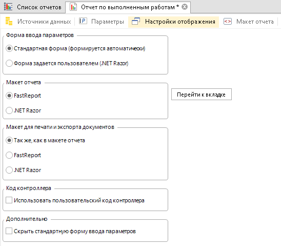 Первые три блока содержат в себе несколько переключателей (вариантов используемых технологий): FastReport и .NET Razor. Справа от выбранного переключателя располагается кнопка Перейти к вкладке, при нажатии на которую осуществляется автоматический переход на вкладку Макет отчетаи/или вкладку Макет отчета (.NET Razor)(для переключателей блока Макет для печати и экспорта документов–вкладку Макет для печати (.NET Razor)) для ее редактирования или на форму ввода параметров.