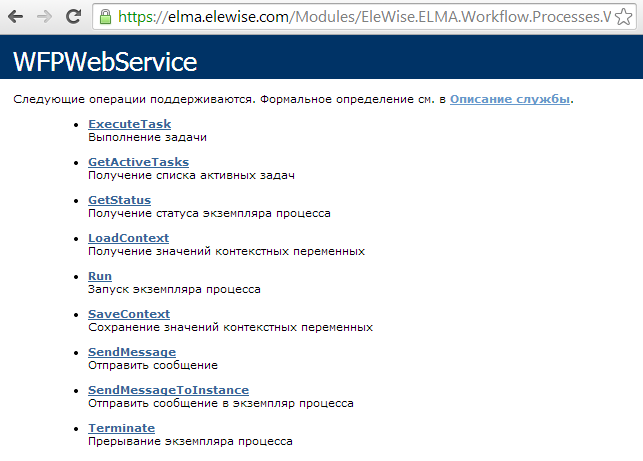 Полный список доступных методов веб-сервиса и описание этих методов можно просмотреть на странице веб-сервиса адрес_сервера/Modules/EleWise.ELMA.Workflow.Processes.Web/WFPWebService.asmx (рис. 1).