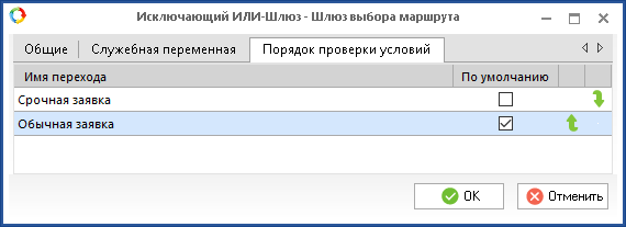 Вкладка "Порядок проверки условий" - доступна для исключающего ИЛИ-шлюза, при наличии двух и более исходящих переходов.