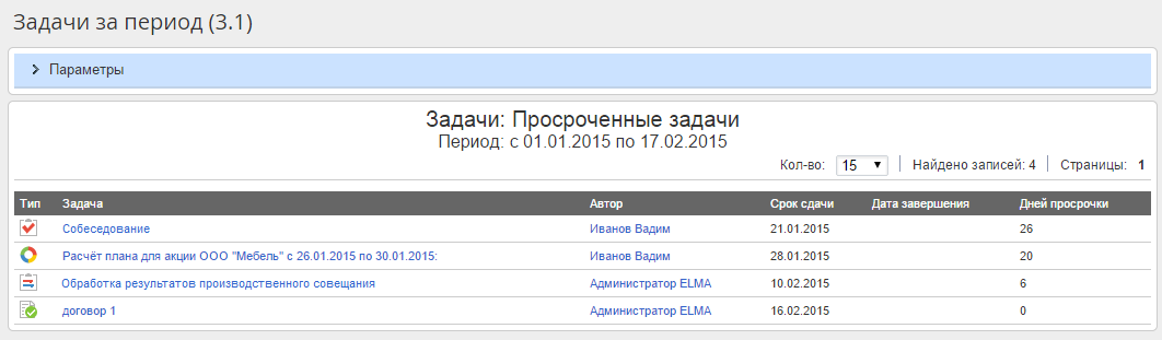 При нажатии на одну из цифр запускается подотчет Задачи за период (рис. 2), в котором отображается подробная информация о выбранном количестве задач.