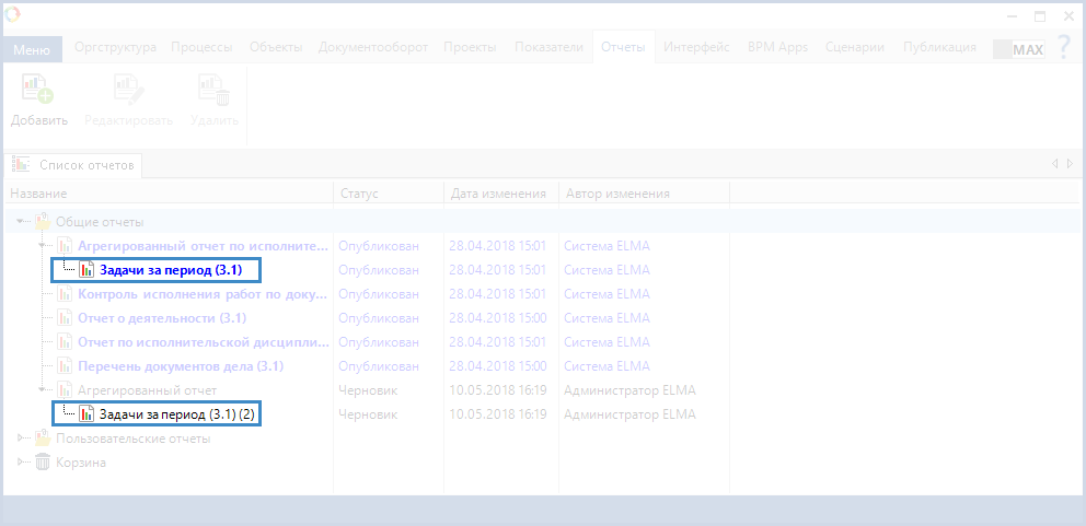 Список подотчетов системы ELMA отображается в Дизайнере ELMA на вкладке Отчеты (рис. 3). Каждый подотчет отображается ниже родительского отчета (вложен в него).
