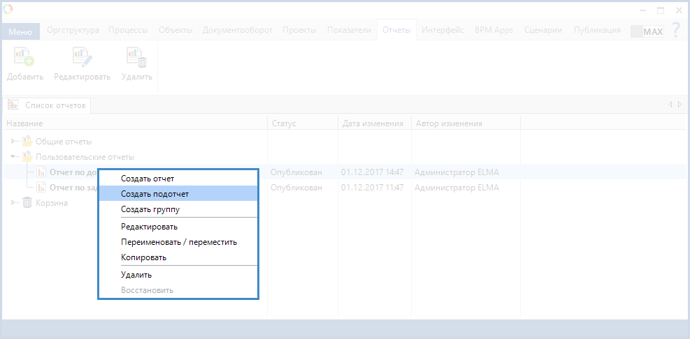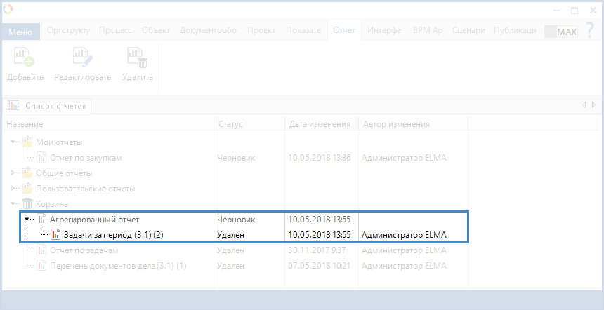 Рис. 7. Дизайнер ELMA. Вкладка "Отчеты". Папка "Корзина"