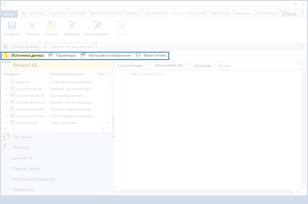 Рис. 3. Дизайнер ELMA. Вкладка "Отчеты". Подотчеты