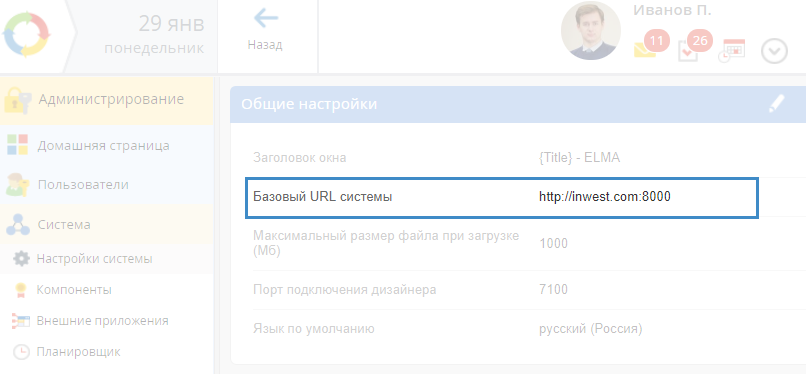 Базовый URL системы с портом, по которому подключено веб-приложение ELMA (рис. 13).