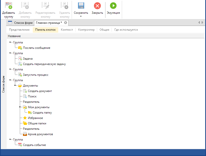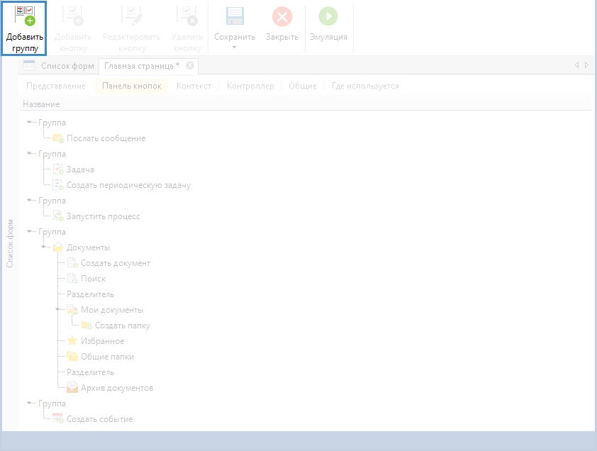 Рис. 3. Карточка страницы. Вкладка "Панель кнопок". Добавление группы