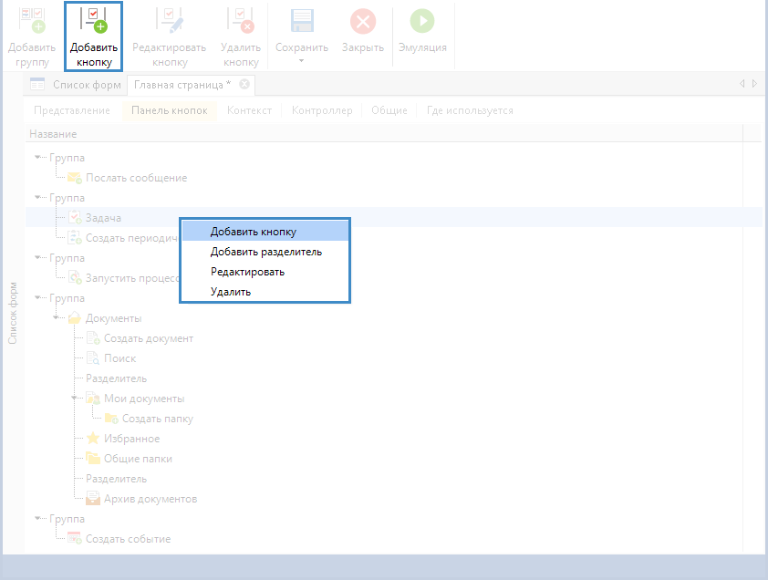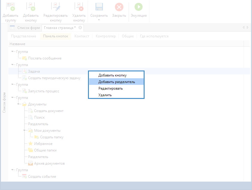 Рис. 6. Карточка страницы. Вкладка "Панель кнопок". Добавление разделителя