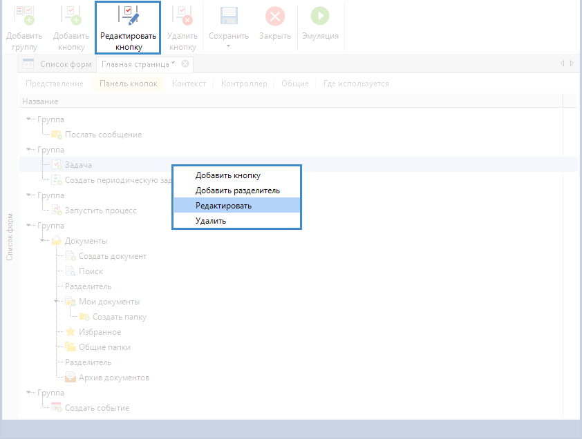 Чтобы изменить настройки кнопки, необходимо выбрать требуемую кнопку и нажать на кнопку Редактировать кнопку, расположенную на панели инструментов, или на кнопку Редактировать, расположенную в контекстном меню (рис. 5).
