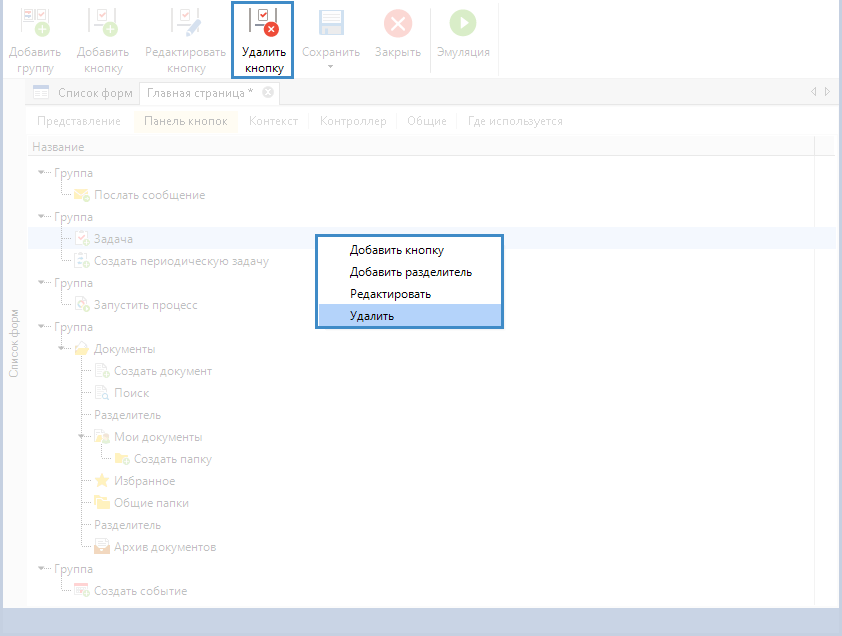 Рис. 7. Карточка страницы. Вкладка "Панель кнопок". Удаление элементов