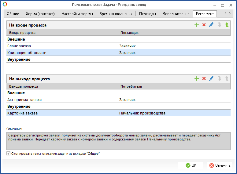 Помимо входов и выходов задачи, определяемых на вкладке Регламент настроек задачи, необходимо описывать входы и выходы процесса.