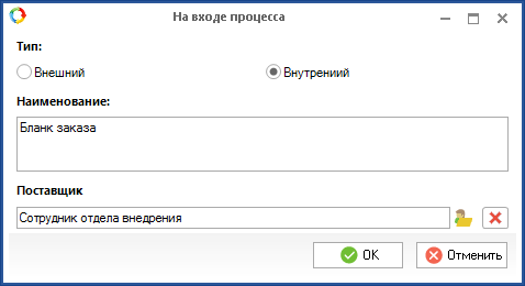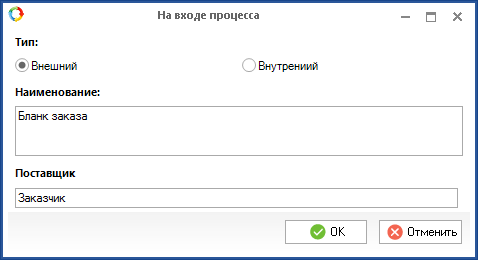 Для внешнего входа (рис. 2) необходимо заполнить текстовые поля Наименование и Поставщик.
