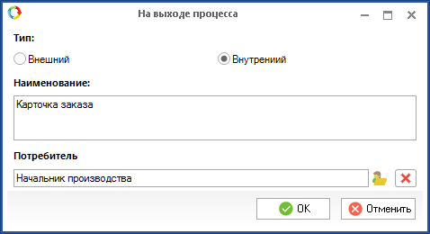 Внутренние - это входы и выходы, через которые происходит взаимодействие с участником процесса, являющимся сотрудником организации, в рамках которой описывается процесс.