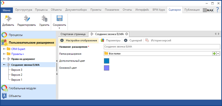 Чтобы открыть карточку, необходимо на вкладке Сценарии Дизайнера ELMA в разделе Пользовательские расширения дважды кликнуть мышью по названию расширения в списке, выбрать пункт Редактировать в контекстном меню расширения или нажать кнопку Редактировать в панели инструментов пользовательских расширений.