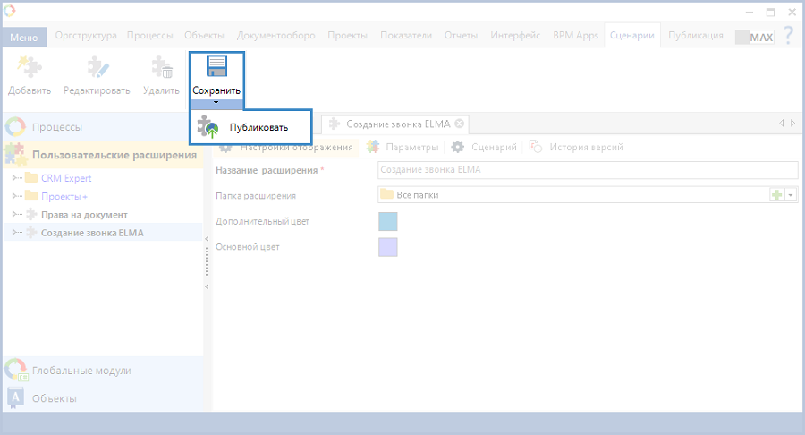 При открытии карточки пользовательского расширения в панели инструментов добавляется кнопка Сохранить, предназначенная для сохранения текущих изменений в системе (рис. 7). Сохраненные изменения не используются в системе до тех пор, пока пользовательское расширение не будет опубликовано. Если нажать стрелку под кнопкой Сохранить, появится кнопка Опубликовать, нажатие на которую приведет к публикации пользовательского расширения в системе. Публикация пользовательского расширения не требует перезапуска сервера. После публикации расширение может быть использовано при моделировании процессов. Если опубликована новая версия пользовательского расширения, во всех новых экземплярах процессов, в которых используется это пользовательское расширение, будет использована новая версия расширения.