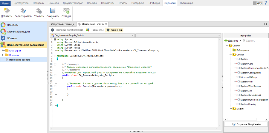На этой вкладке можно создать или изменить сценарий, используемый в пользовательском расширении. Сценарий пишется на языке C#. На данной вкладке доступны специальные инструменты написания сценариев, такие как синтаксическая подсветка кода, технология автодополнения функций и переменных IntelliSense, ссылки на сборки и веб-сервисы.