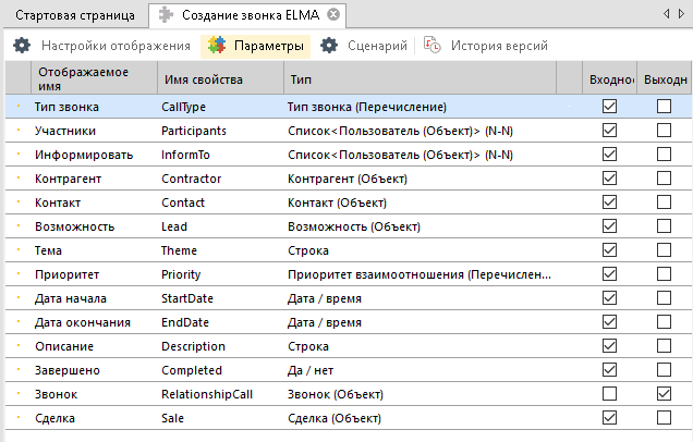 Отметить какой параметр будет входным, а какой выходным можно флажками в столбцах Входное, Выходное.