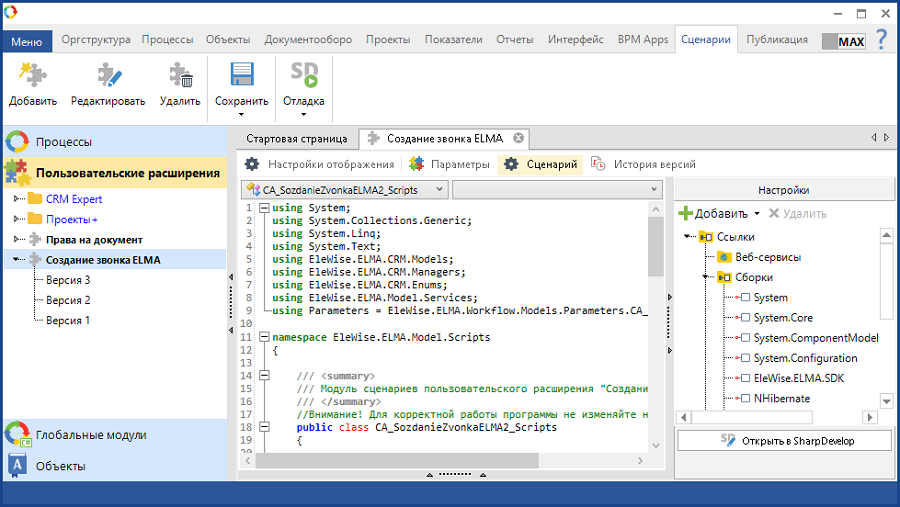 В системе ELMA доступна возможность проведения отладки работы пользовательских расширений (рис. 8). Данная возможность доступна в карточке пользовательского расширения и может быть осуществлена как с использованием SharpDevelop, так и с использованием Visual Studio (по аналогии с отладкой сценариев процессов). Отладка доступна только после публикации пользовательского расширения.