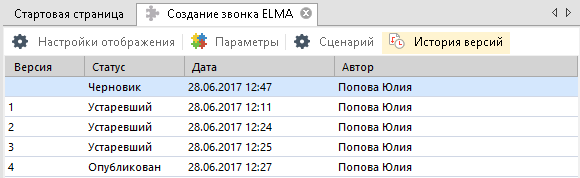 Список версий также отображается в левом меню на вкладке Сценарий подраздела Пользовательские расширения. При нажатии на пиктограмму