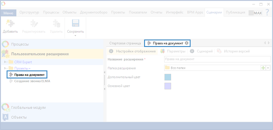 Пользовательские расширения создаются на вкладке Сценарии Дизайнера ELMA.