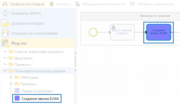 Рис. 3. Использование названия пользовательского расширения на вкладке "Сценарии" Дизайнера ELMA