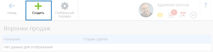 Для создания воронки продаж необходимо открыть справочник Воронка продажи в верхнем меню нажать на кнопку Создать (рис. 1).