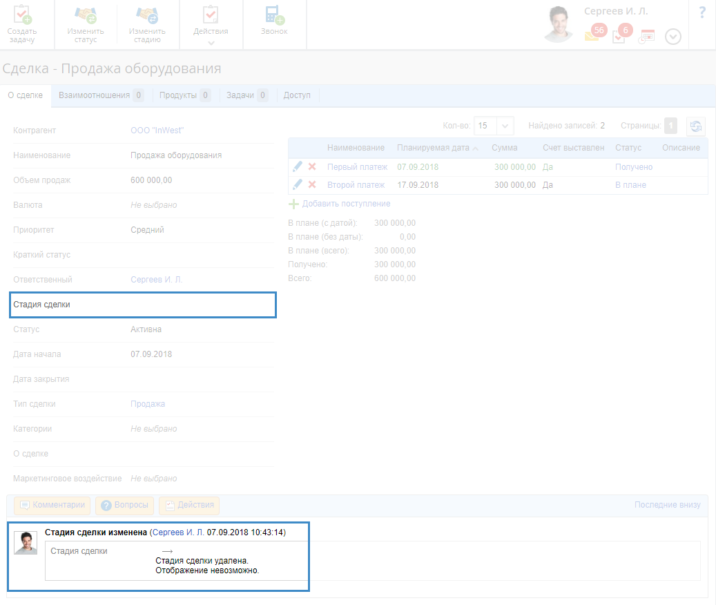 Рис. 5. Карточка сделки, стадия которой была удалена