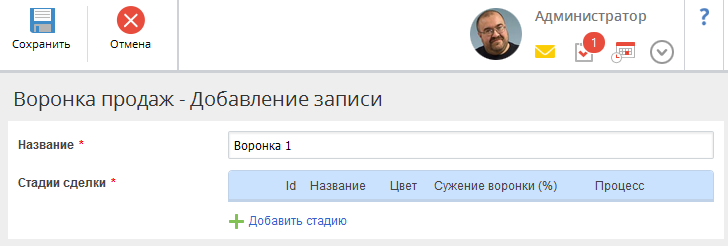 Воронки продаж создаются в справочнике Воронка продаж. При создании воронки продаж добавляется необходимое количество стадий сделки, а также указывается их порядок.