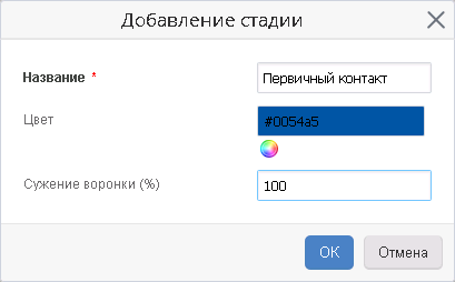 Стадии сделки *– блок для добавления стадий сделки создаваемой воронки продаж, а также определения их порядка. Каждая стадия сделки уникальна. Названия стадий различных сделок могут совпадать, но сами по себе они являются разными объектами.