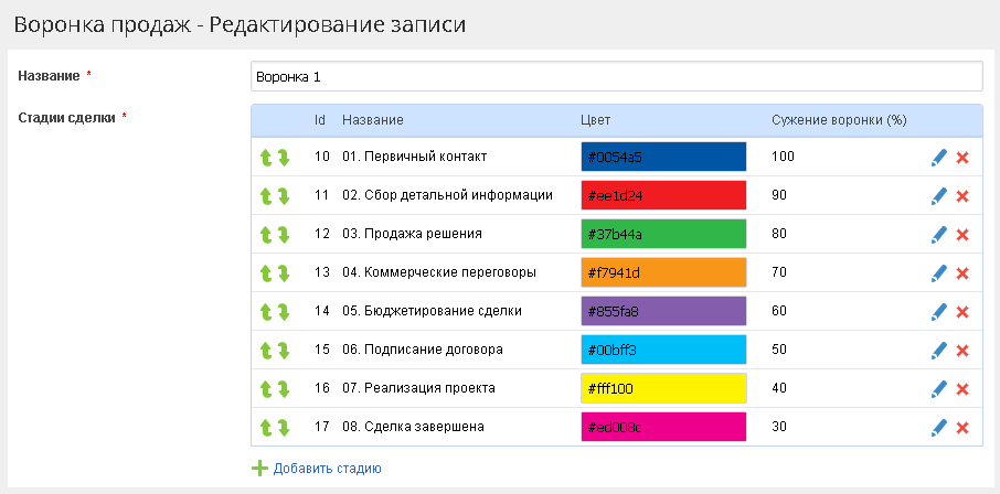 Для изменения порядка стадий сделок необходимо использовать кнопки для перемещения стадий вверх/вниз в пределах данного списка. На данной странице стадии сделок подсвечены различными цветами (в зависимости от принадлежности к той или иной воронке продаж).