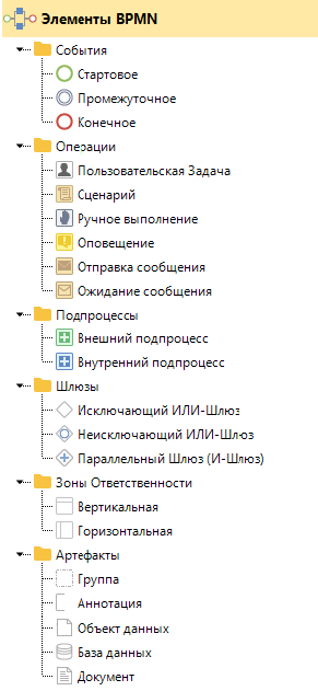 Рис. 1. Боковая панель инструментов графической модели, раздел "Элементы BPMN"